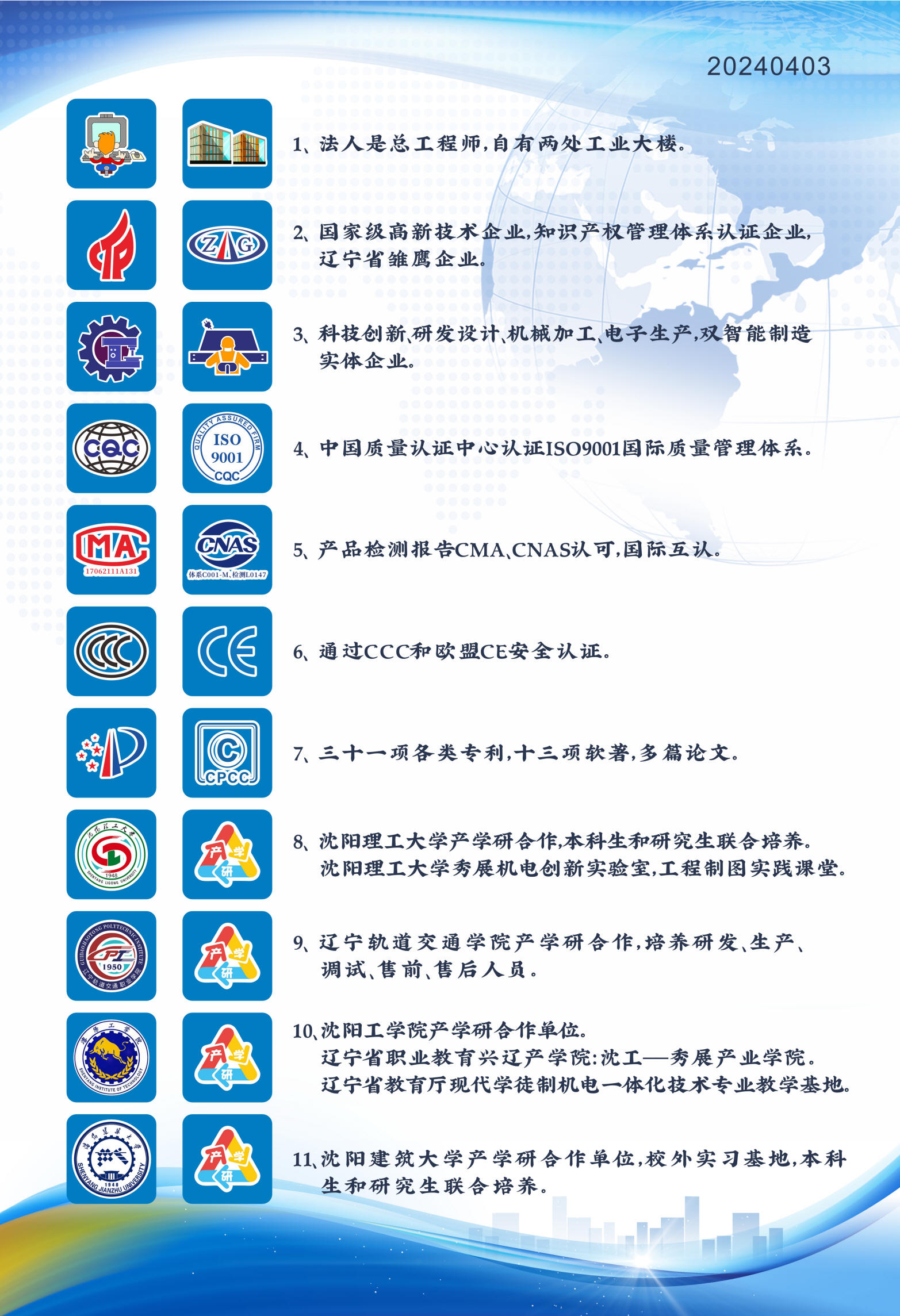 秀展科技是国家级高新技术企业,国家知识产权局认定的高端装备制造企业,科技部认定的科技型中小企业,通过ISO9001质量管理体系认证,通过知识产权管理体系认证,通过欧盟CE安全认证,国内3C认证。21年12月17号成立联合党支部,并 任党支部书记。法人是总工程师,自有两处工业大楼。
